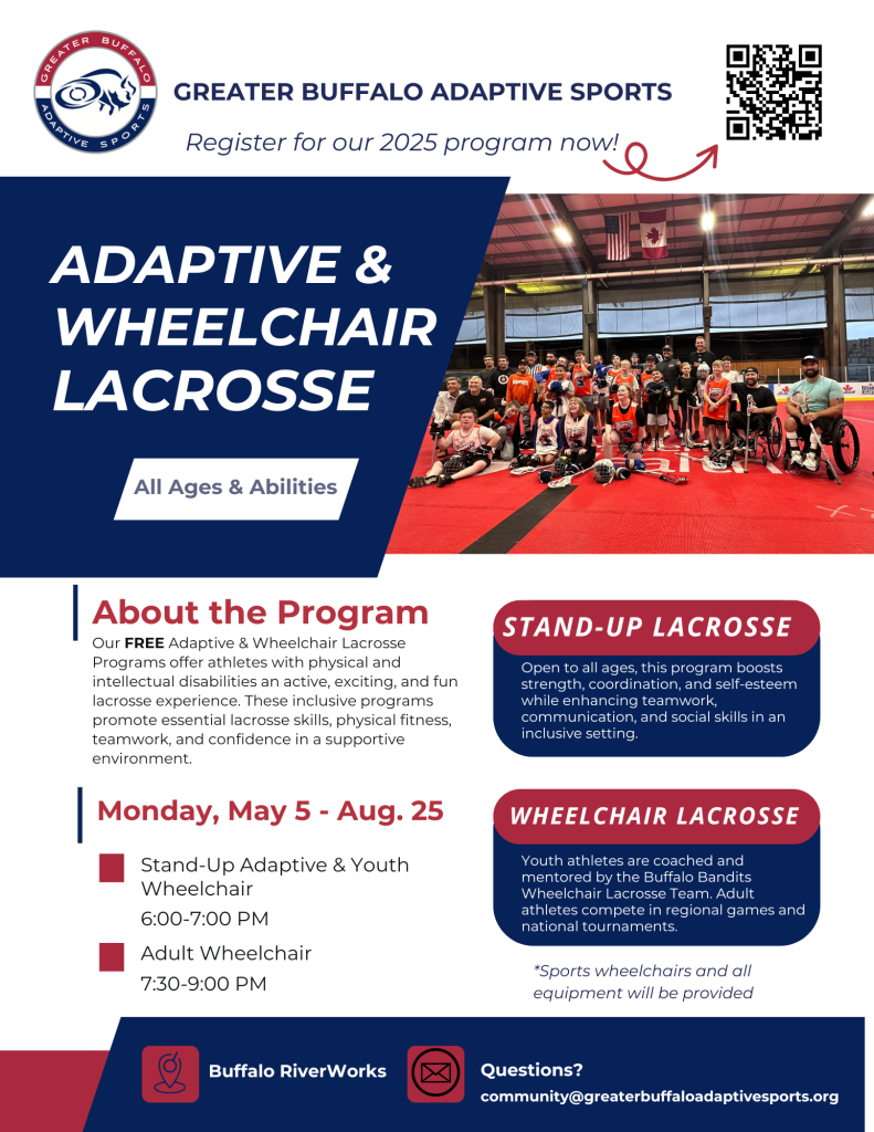 Our wheelchair lacrosse team competes in regional matches and tournaments throughout the year and is affiliated with the Buffalo Bandits NLL lacrosse team. The team meets for regular practices but anyone is welcome to stop by and give lacrosse a try. If you can hold a stick and maneuver your chair, you can play.
